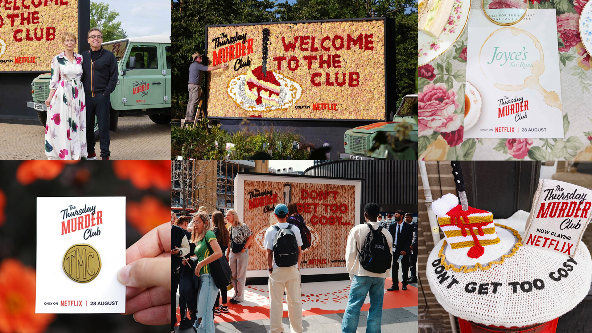 The cosy vibe expanded into flower arrangements, specifically a partnership with the Royal Horticultural Society to create a murder mystery event to launch the film, complete with a murder-themed garden.
