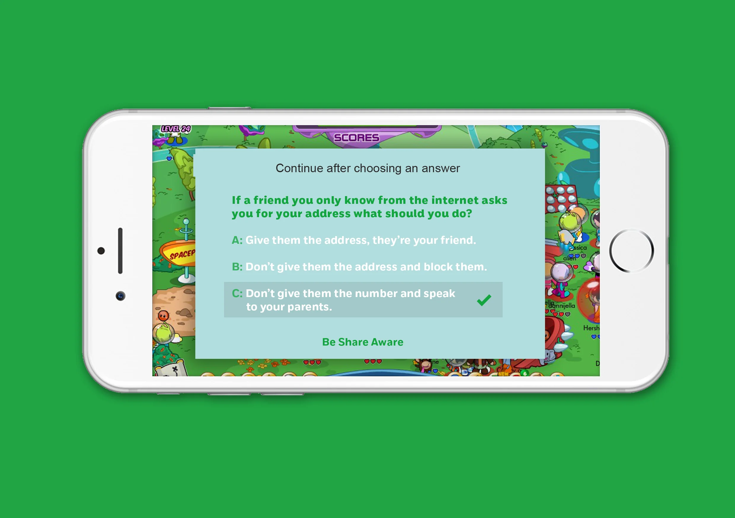 We also planed to follow up our TV spot and app with mobile ads within kids' games. These would test their internet safety knowledge, and direct them to approved advice.